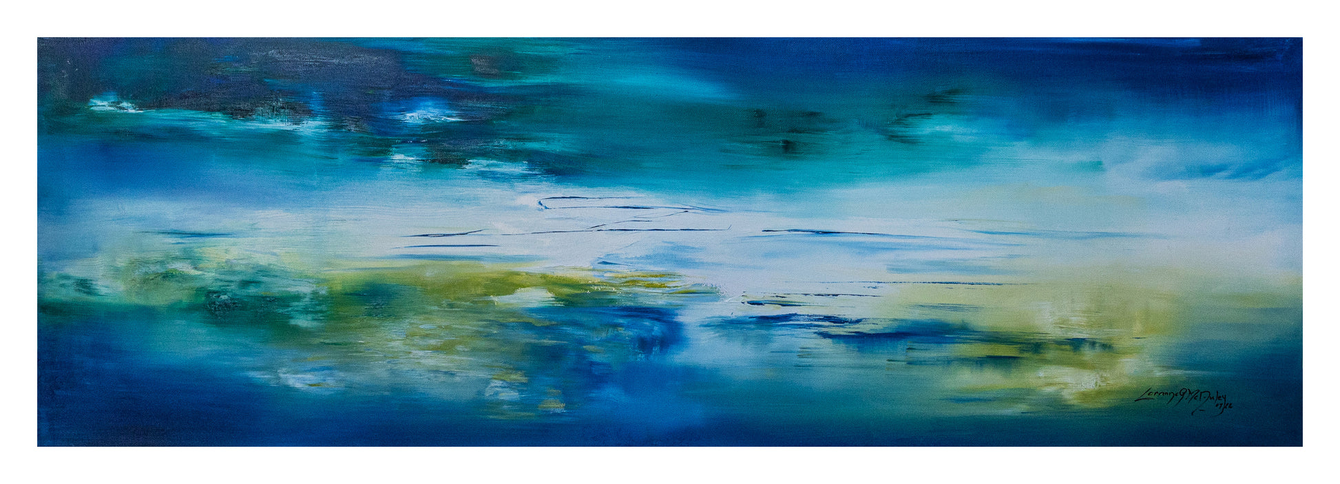 A luminous abstract seascape print from oil on canvas with vibrant blues, greens, and soft white highlights. The horizontal flow and blurred forms evoke light dancing on water, creating a sense of movement, depth, and peaceful energy.