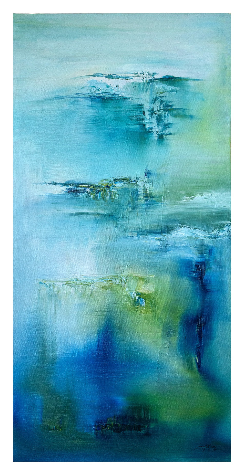 A calming abstract print from oil on canvas with flowing shades of blue, green, and white. The soft, layered brushstrokes suggest reflections on water, creating a peaceful and dreamy atmosphere.